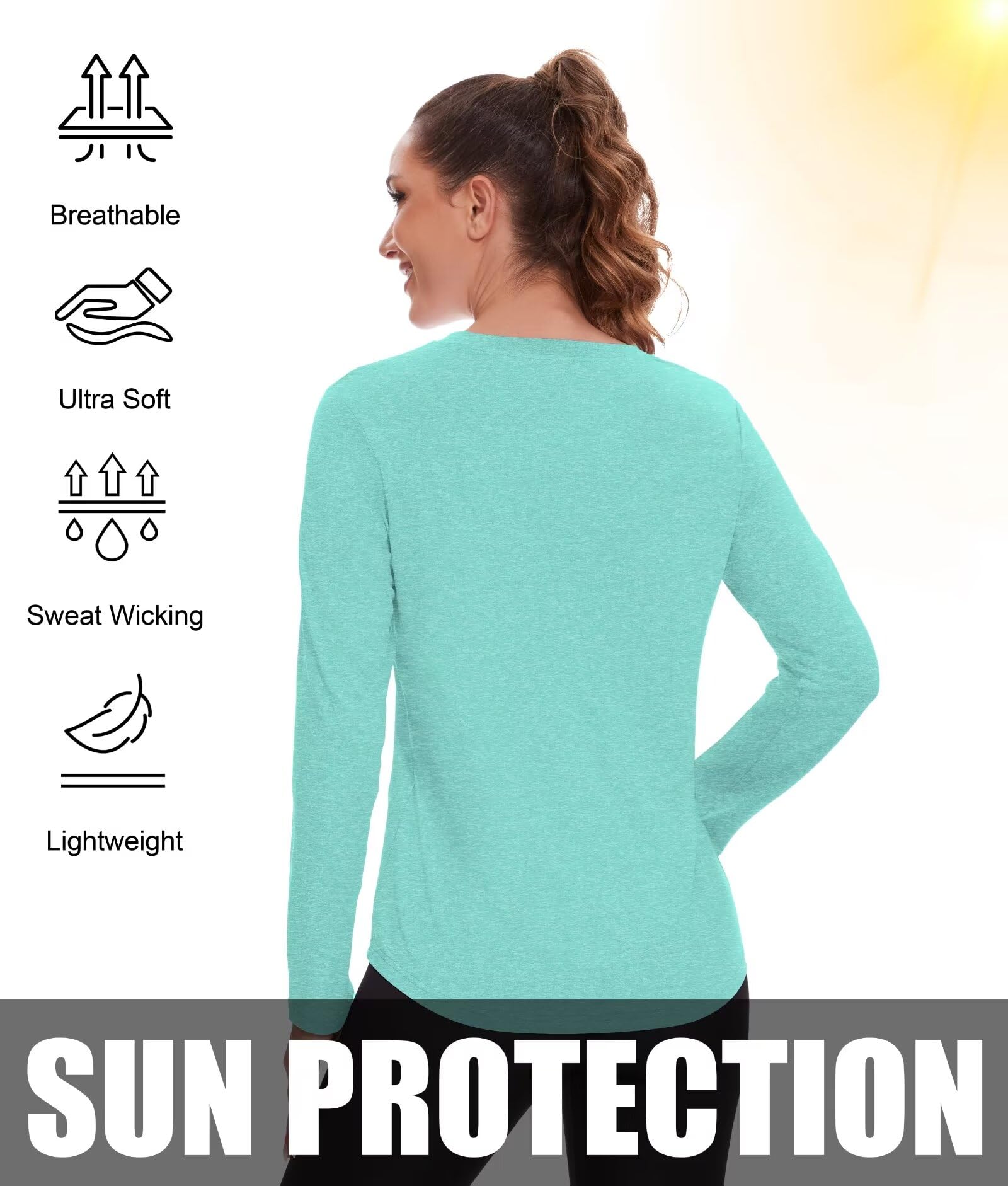 - 【UV Protection】Womens long sleeve workout shirts provide sun protection for the body and neck, with all-around protection from the sun’s harmful UVA/UVB rays
