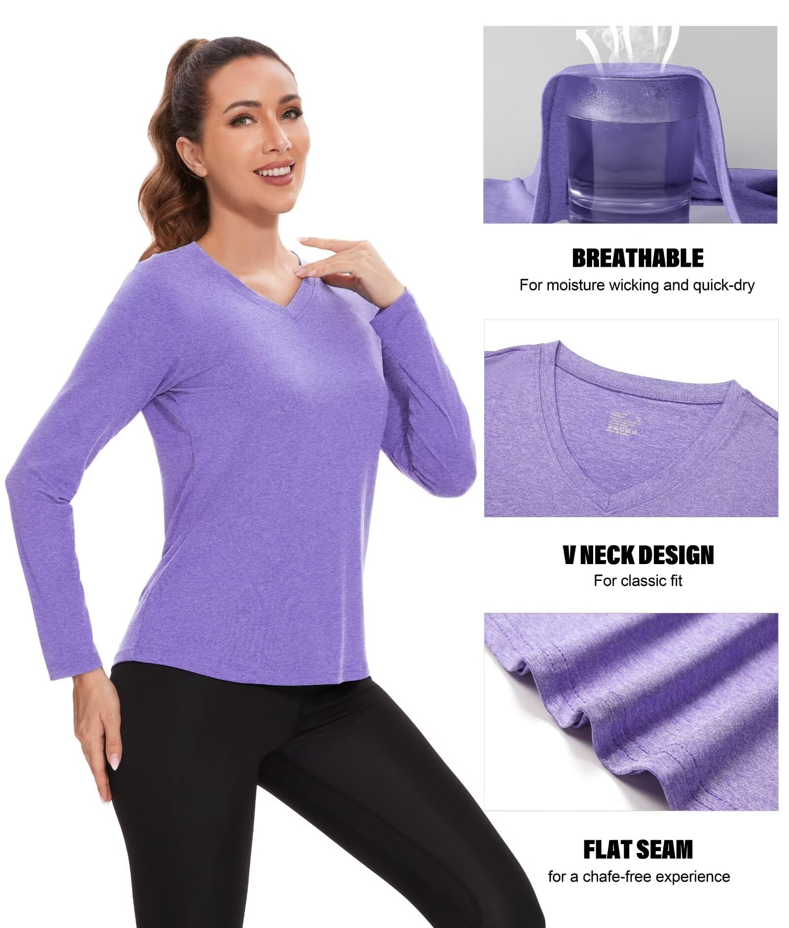 - 【Comfy & Pretty】Cooling shirts for women are smooth, soft, with highly stretchy fabric make you feel comfy with it every moment. Classic long sleeve workout shirts for women v neck loose fit, it just goes well pair with everything