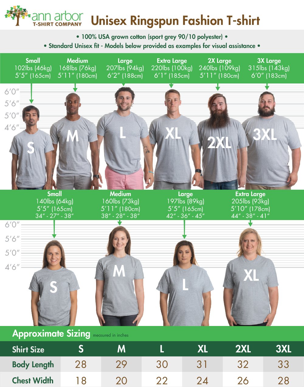 - UNISEX MODERN FIT SIZING | this shirt is slightly tapered to be a little less boxy than the old style of mass-market t-shirt. Nothing drastic, and most people wear the same size in our shirts as they do in all of their others, but you might go one size larger if you’re on the fence. It is pre-shrunk, but like any high-cotton product, will still shrink slightly in the wash. Our model photos are the real thing – the actual shirt on our salesguy, Rich. He’s 6′ 2″, 200 lbs and wearing a large