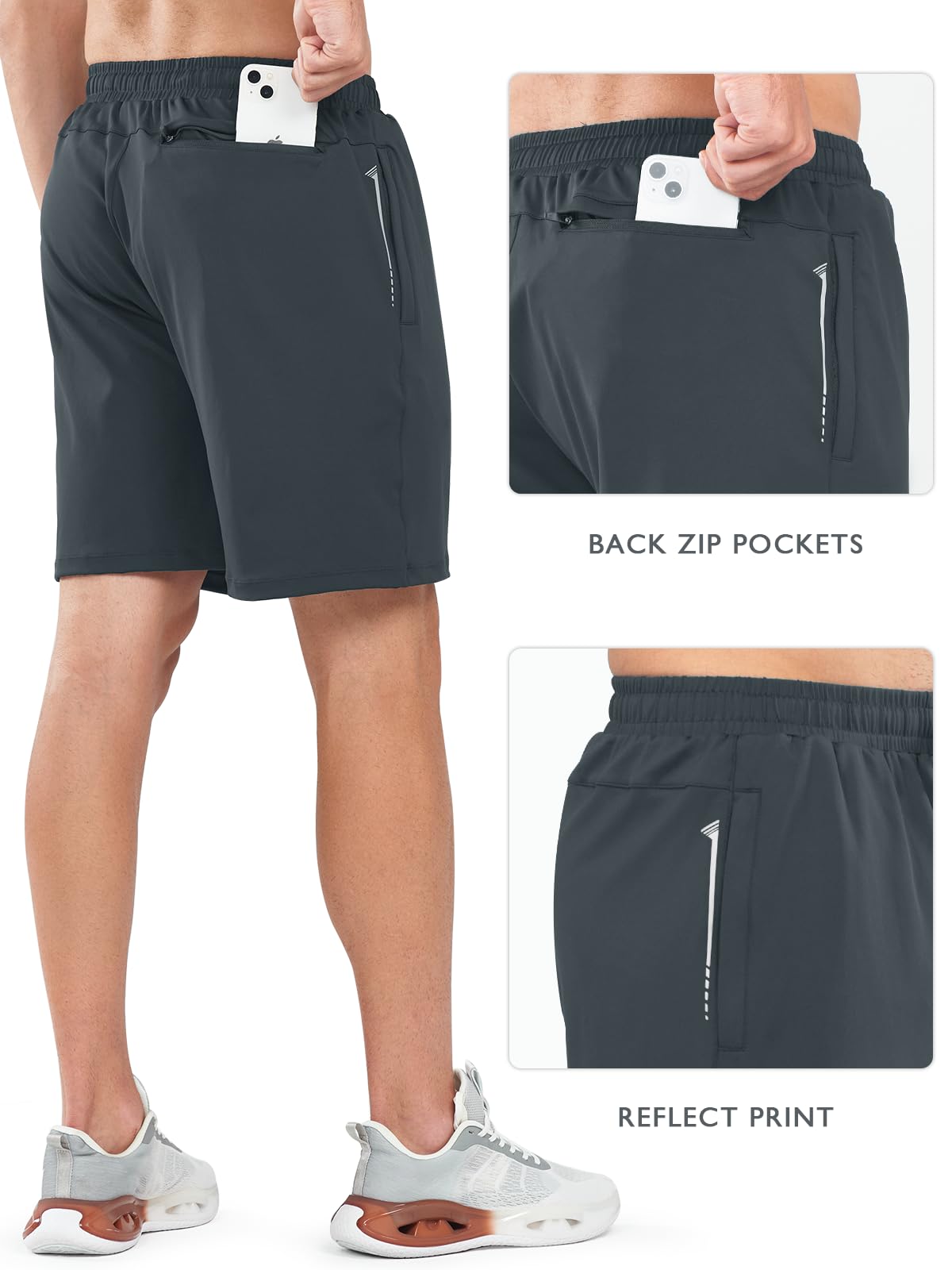 - Reflective Strip and Zipper Cover: men’s running shorts are equipped with reflective strips on both side zip pockets. To enhance safety and better casual look, we have discreetly covered the zipper with a cloth bar, ensuring a seamless appearance that eliminates any risk of scratching during exercise