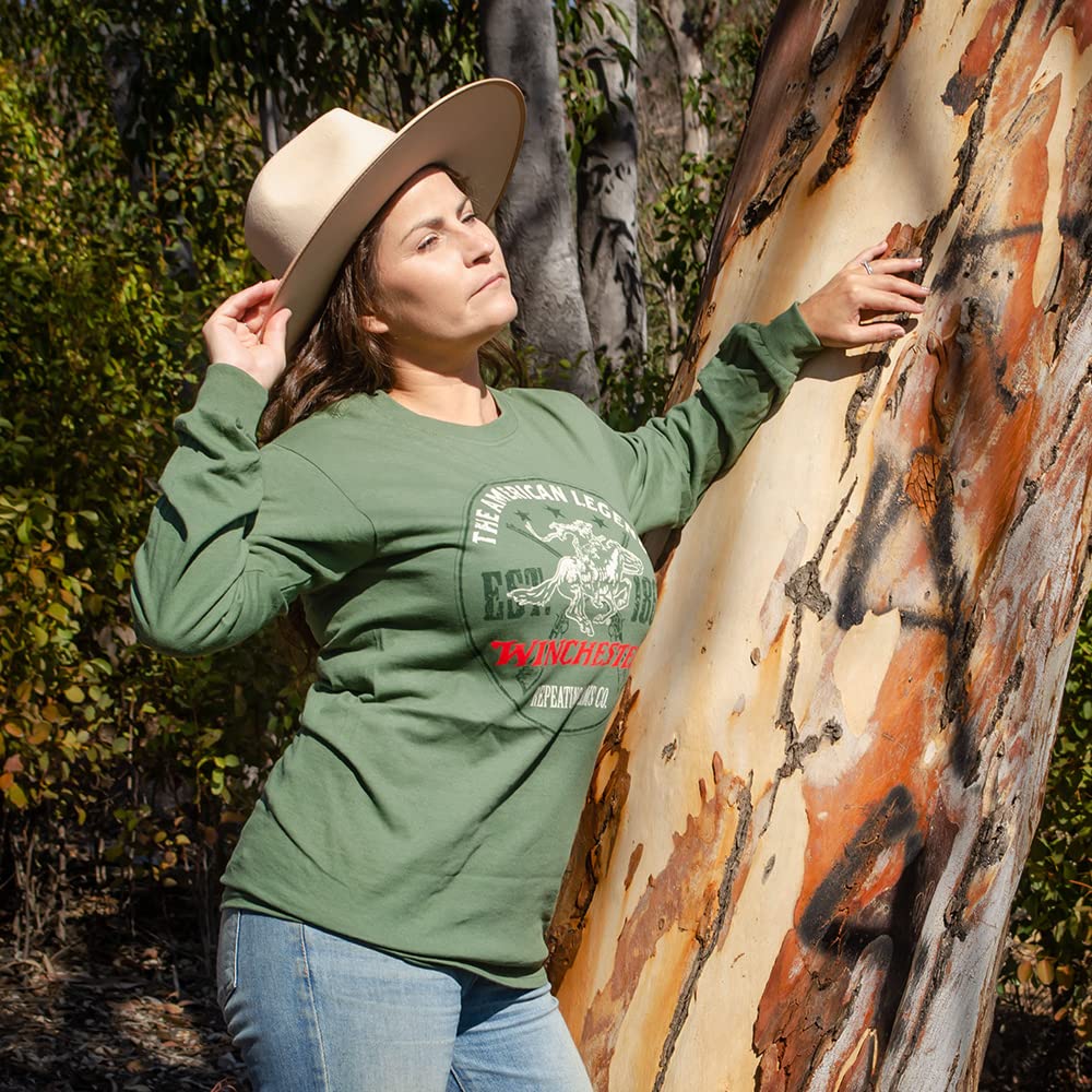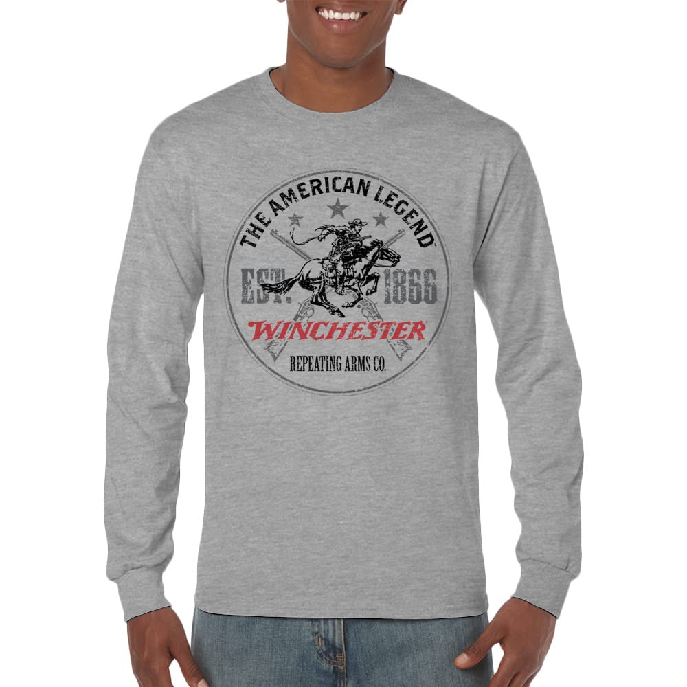 - Official Licensed Winchester Repeating Rider Legend Logo – Men’s long sleeve T-Shirt featuring a front print of the repeating rider legend logo. This design is also available in Short Sleeve Tees and Hooded Pullover Sweatshirts.
