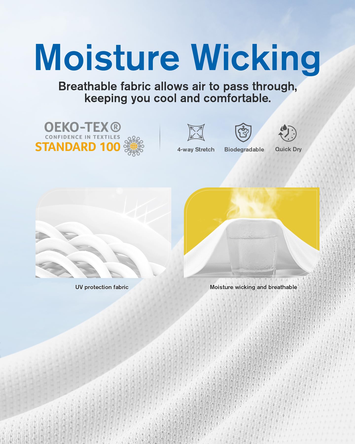 100% Polyester, Super Stretchy, Quick Dry, SPF 50+, Skin-friendly, Moisture Wicking, Breathable.